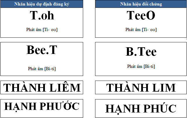 Về phát âm: Những trường hợp ví dụ sau thể hiện việc mặc dù cấu trúc và trình bày khác nhau nhưng Nhãn hiệu dự định đăng ký vẫn có phát âm tương tự gây nhầm lẫn với Nhãn hiệu đối chứng, do đó Nhãn hiệu dự định đăng ký bị coi là tương tự gây nhầm lẫn với Nhãn hiệu đối chứng và không đáp ứng tiêu chuẩn bảo hộ: