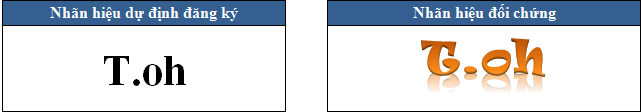 Về cấu trúc: Trường hợp ví dụ sau thể hiện việc mặc dù được thể hiện cách điệu nhưng Nhãn hiệu dự định đăng ký vẫn bị coi là tương tự gây nhầm lẫn với Nhãn hiệu đối chứng do cấu trúc các chữ cái tạo nên 02 nhãn hiệu đều giống nhau, cụ thể 02 nhãn hiệu đều bao gồm các chữ cái T-O-H, có dấu chấm ở giữa “T” và “OH” và do đó, đều được phát âm thành 2 âm tiết /Ti/- /oʊ/ và đều được tạo thành bởi các chữ T O và H theo cùng thứ tự sắp xếp, còn gọi là tương tự gây nhầm lẫn về cấu trúc nhãn hiệu: