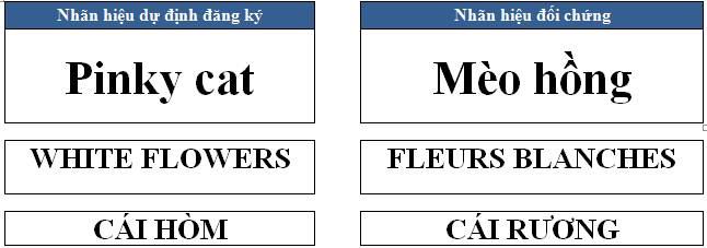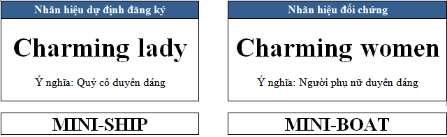 Về ngữ nghĩa: Những trường hợp ví dụ sau cho thấy mặc dù được trình bày bằng ngôn ngữ khác nhau nhưng 02 Nhãn hiệu dự định đăng ký bị coi là tương tự gây nhầm lẫn với Nhãn hiệu đối chứng do có cùng nghĩa, ý nghĩa và dịch nghĩa.