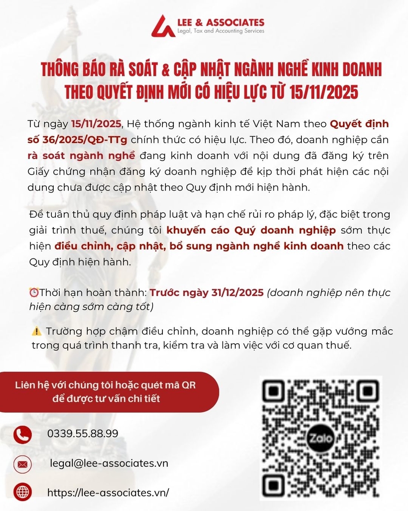 THÔNG BÁO RÀ SOÁT & CẬP NHẬT NGÀNH NGHỀ KINH DOANH THEO QUYẾT ĐỊNH MỚI CÓ HIỆU LỰC TỪ 15/11/2025